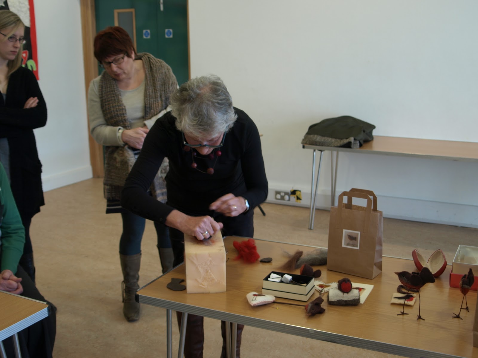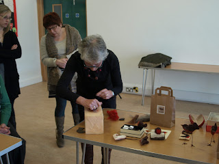 Another lovely workshop took place on Saturday 5th November, this time by Hungarian born Gabi Mc Grath. To commence we were given a brief insight into felting in Turkmenistan, how it is used for rug making and actual houses for the tribes. We looked at traditional designs and patterns and had fun trying to copy and personalise our own design for the small rug we were about to make. We mostly used the curly motif depicting the horns of the ram. We used hungarian wool and under Gabi's supervision transferred our designs outlining the pattern with thin strands of wool-then filling in using chunky pieces.