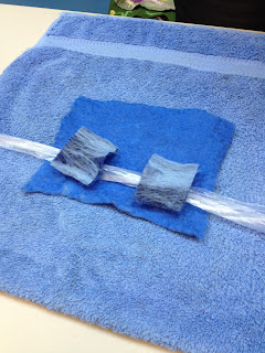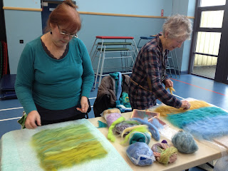 Sarah Jarden delighted us with her knowledge and skill for our March Felt in. (above some of Sarah's lovely hand spun wool!) Sarah started by showing us various methods of carding wool, including using a small dog brush, she did advice us to have a piece of leather over our knee as getting your leg carded is a very painful process!