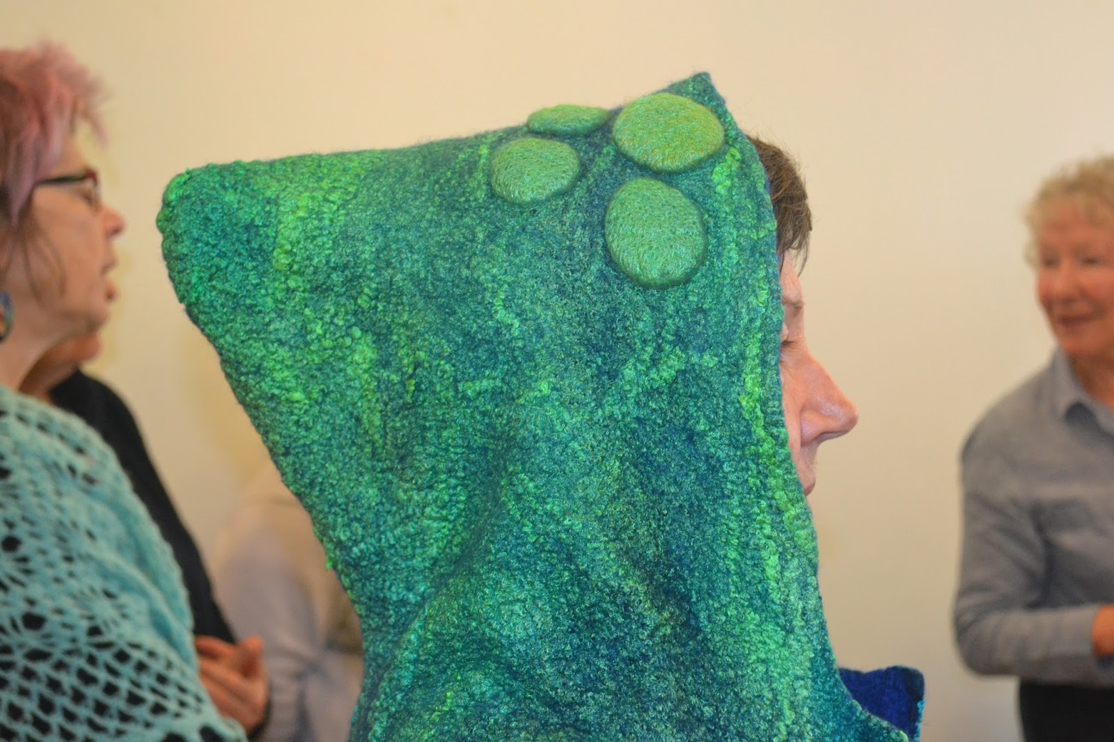 Dorothy whose own creations are a great source of inspiration, talked us through some of the myriad of samples which she had brought along explaining about using up to nine layers of prefelt as in the hood of this little jacket to pinching and stitching to create ridges and to adding nepps to make uneven lumpy surfaces.