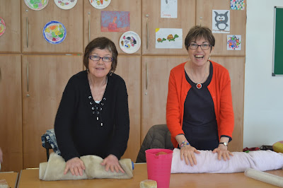 Of course we had our usual Show n Tell before we all got felting and Fiona who's hiding behind her hanging, shared her felted image of mountain sheep which everyone loved